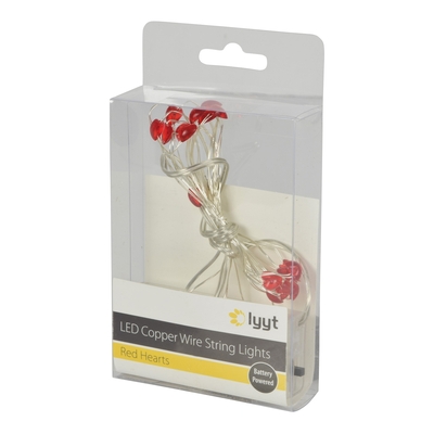 A pretty little set of tiny red heart led fairy lights set on clear poseable cable, these fairy lights can easily be incorporated into displays, moulded around mirrors, placed in jars, even incorporated into your outfit. The hearts are spaced 10cm apart & there are 20 of them, giving 1.9 metres of illumination, with a further 30cm cable from the battery pack to the start of the lights. 20 x red LED hearts 2 x AA Batteries (not included)LED spacing: 10cm Length of illumination: 1.9m Length of lead from battery pack to first light: 30cm Total length 2.2m Heart LEDs measure: 8.66mm