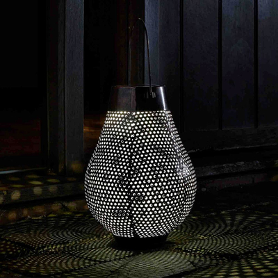 With it's rustic metal body & perforated design, this decorative garden lantern looks the part in the day but is absolutely striking at night. Lit by a bright white LED, the light shines throughout the lantern night after night casting a decorative silhouette onto surrounding surfaces for enchanting garden lighting. Place on table tops, on decking, patios or hang in trees for atmospheric garden lighting that's solar powered & so is completely wire free charging through out the day to illuminate at night.
