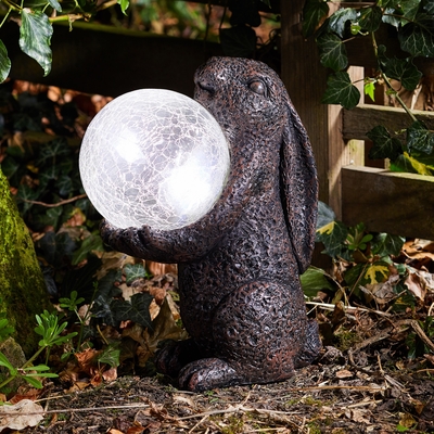 An adorable garden ornament that's packed with animal charm, this hare magic decoration adds atmospheric light to your garden & outdoor spaces. Cast in resin, a sweet little hare sits on its haunches, holding a crackle glass ball aloft, that shines from the darkness. Set to colour change or the white light option, & this cute character will charge throughout the day before automatically switching on at night, adding sparkle to patios, borders & seating areas around your garden.